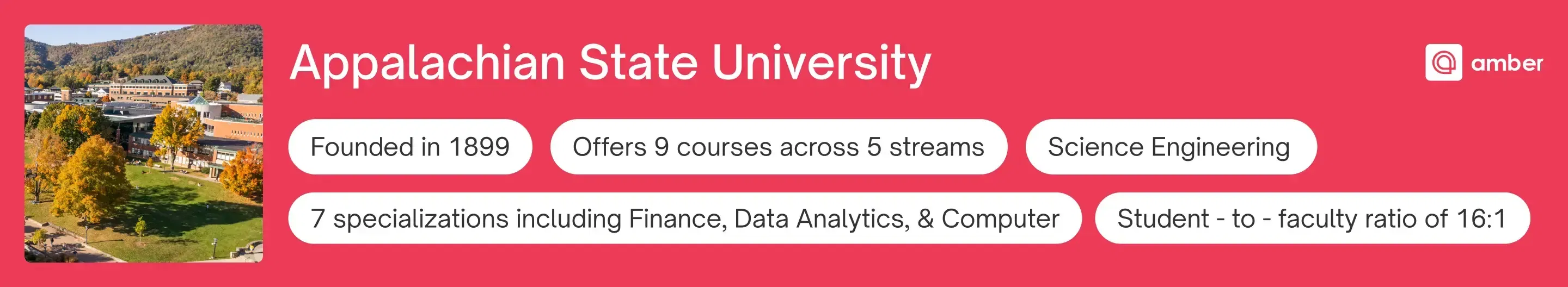 Appalachian State University offers great academic options for international students. It has 9 courses at undergraduate and postgraduate levels in streams like IT, Engineering, and Business. UG programs include B.E./B. Tech and BBA, usually completed in 4 years. PG options include MBA, MS, and MIM, mostly 1-year programs. Popular specializations at Appalachian State University are Finance, Data Analytics, and Computer Science Engineering.