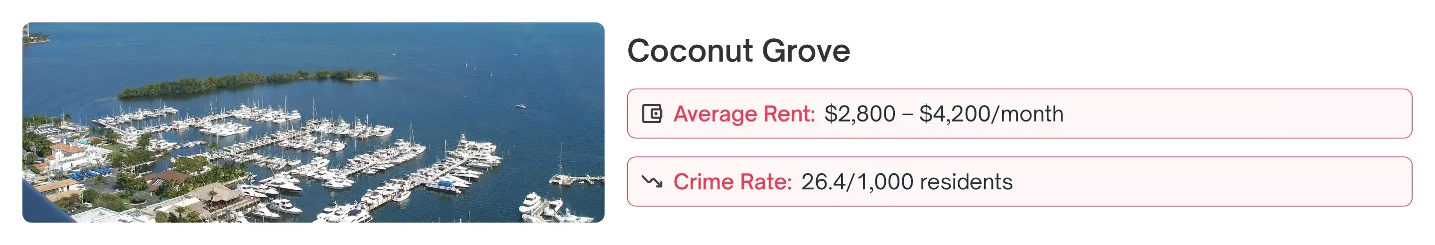 Coconut Grove Miami also has a lot of parks, marinas, and outdoor cafes, like The Kampong, Coconut Grove Bike Path, and Dinner Key Marina. For students and scholars, the Grove provides proximity to a number of educational institutions and cultural institutions, while also ensuring comfortable student housing in Coconut Grove.