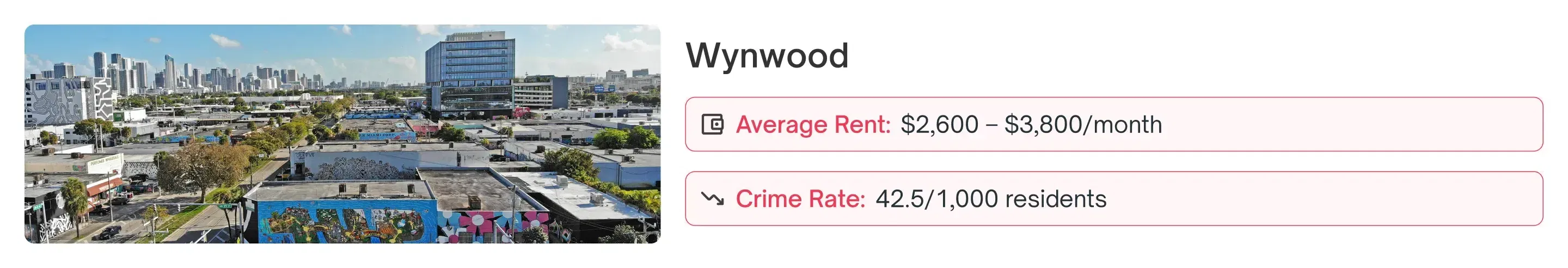 From finding student housing in Wynwood to a staycation resort, this neighborhood is one of the safest in Miami. Wynwood's diverse blend of boutiques, cafes, and breweries, like Casa La Rubia, Temple Wynwood, and MIAM Cafe, contributes to its uniqueness, attracting young professionals and creatives from all walks of life.