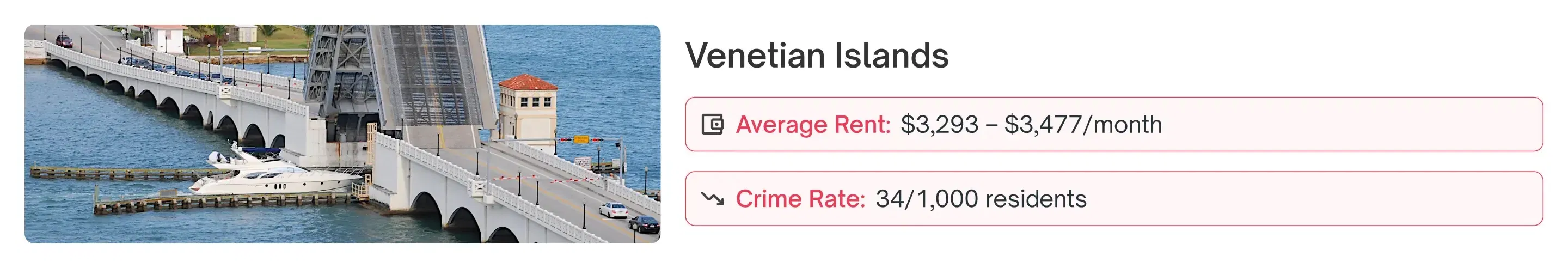 Closely linked to the Venetian Causeway, the Venetian Islands are a series of man-made islands elegantly stretched across Biscayne Bay, connecting Downtown Miami to Miami Beach. With the Adrienne Arsht Center, Perez Art Museum, and Miami Dade College Wolfson Campus within a hop, skip, and jump away, student housing in Venetian Islands provides a serene sanctuary to academics who desire access to amenities without sacrificing the tranquility of island life.