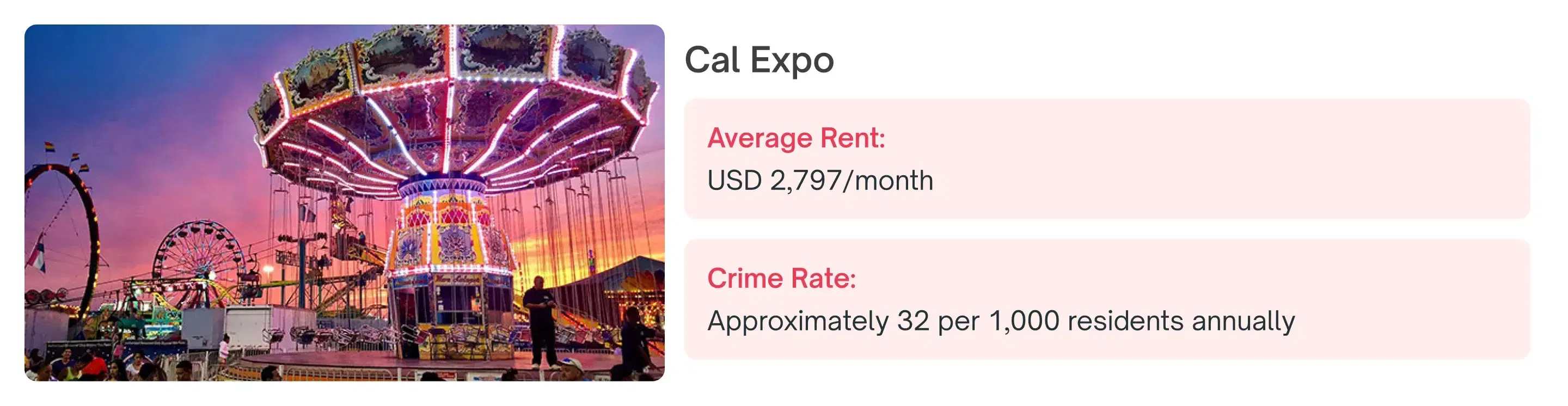 Cal Expo is a lively area in Sacramento, known for its mix of quiet residential streets and exciting entertainment spots. Known for being home to the annual California State Fair, it’s a hub of activity, attracting thousands of visitors each year. Residents enjoy the proximity to the Sacramento Horse Racing Track and Raley Field, where you can catch a River Cats game. For those who love the outdoors, the American River Parkway is nearby, perfect for biking, hiking, and enjoying nature.