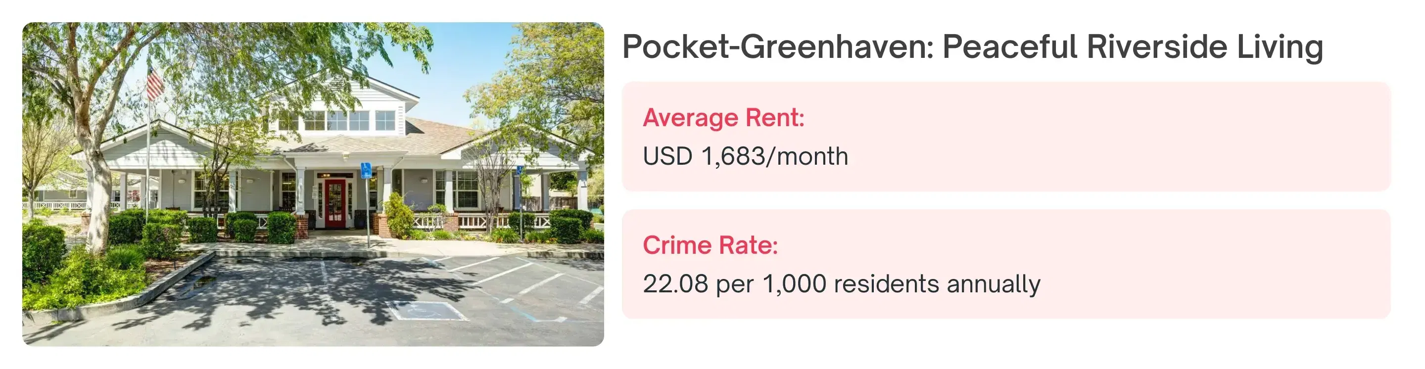 The Pocket-Greenhaven area constitutes one of the best areas to live in Sacramento CA, for those seeking a peaceful, suburban feel while remaining within city limits. The Pocket-Greenhaven features many homes with scenic waterfront views, where prices range from USD 650,000 for renovated mid-century ranchers to over USD 1 million for expansive contemporary builds.