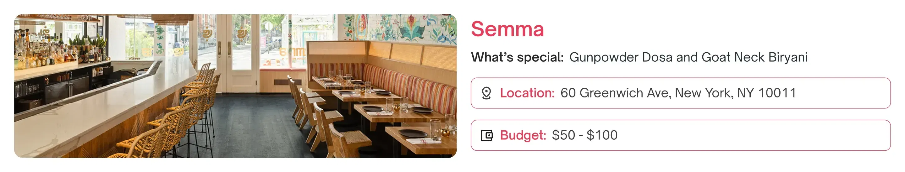 With a relaxed, intimate vibe, Semma appeals especially to students and South Asians craving familiar flavors. Committed to authentic and quality ingredients, Semma delivers a rich South Indian culinary journey within the city’s lively energy.