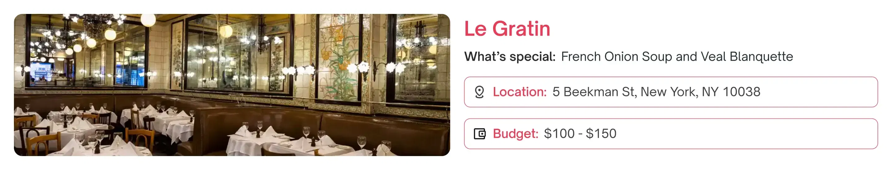 The relaxed, old-world vibe makes it a hit among law students from Pace and NYU Stern grads who want something reliably good between classes or meetings. Whether you're sipping a house red or ending with crème brûlée, Le Gratin is a neighborhood classic, just with better lighting.