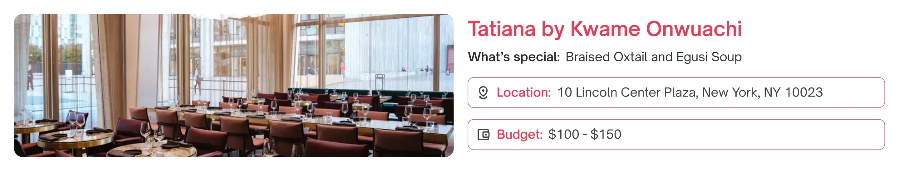 Tatiana presents a vibrant fusion of Caribbean and African-American cuisines, skillfully blending traditional flavors with contemporary flair. The menu features comforting favorites like callaloo, jerk chicken, and spiced plantains, each packed with bold, well-balanced seasonings.