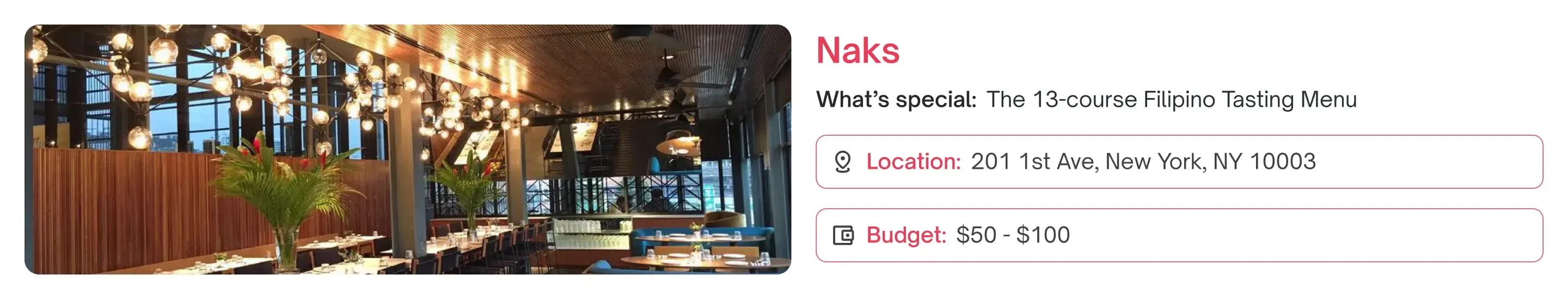 Naks is known for its inventive Filipino cuisine served through a carefully curated multi-course tasting experience. Highlights include bold dishes such as adobo liver mousse and oysters infused with sinigang flavors. The restaurant’s intimate atmosphere and exceptional service make dining here truly memorable.