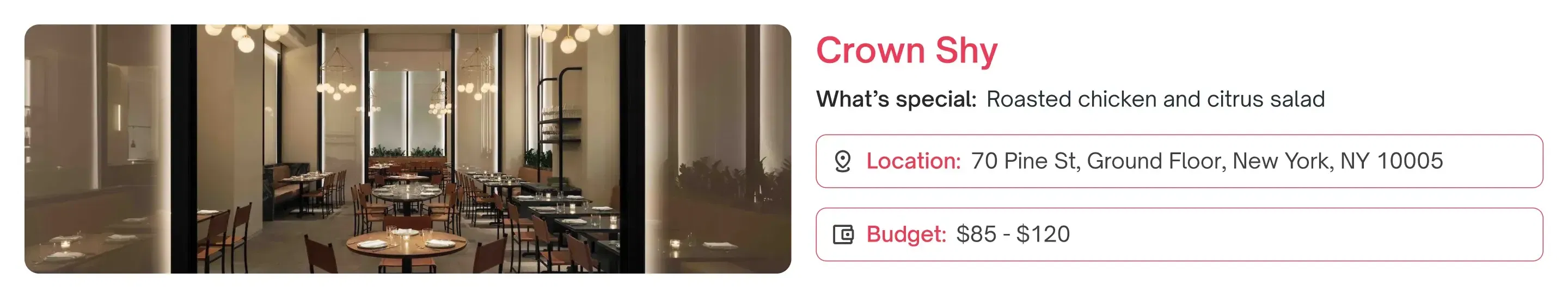 Crown Shy serves bold, seasonal American fare in a sleek, welcoming space, no tasting menu required, making it perfect for lunch or dinner. Serving seasonal favorites like seared fish and braised short ribs alongside their signature house-baked sourdough, Crown Shy balances bold flavors with great value.