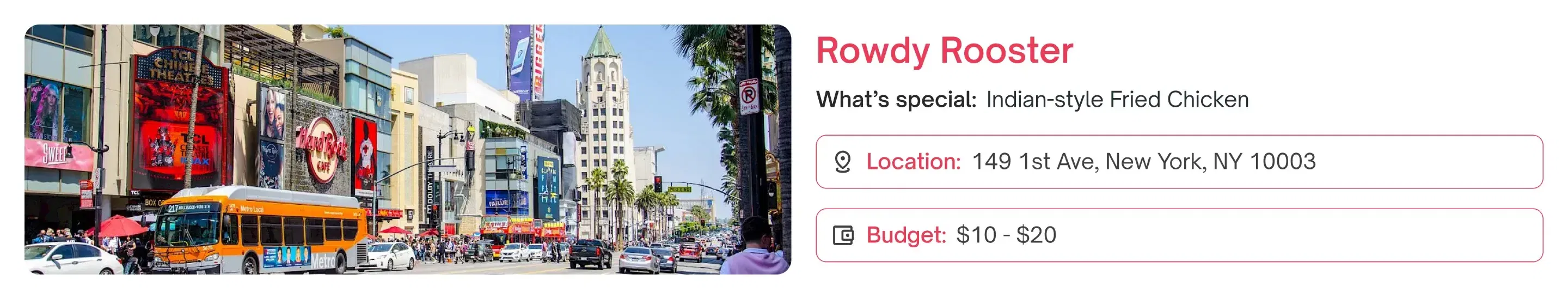 Rowdy Rooster is a cozy spot known for its spicy Indian-inspired fried chicken and spicy sandwiches like the Big Rowdy with pickled onions and mint chutney on a potato bun. You can also enjoy flavorful thali boxes featuring dal, rice, and pickles for a complete meal.
