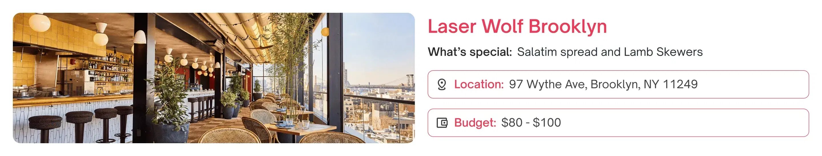 Laser Wolf Brooklyn is a lively rooftop spot known for its grilled meats and stunning Manhattan skyline. This Philly favorite blends a vibrant party atmosphere with skilled cooking.