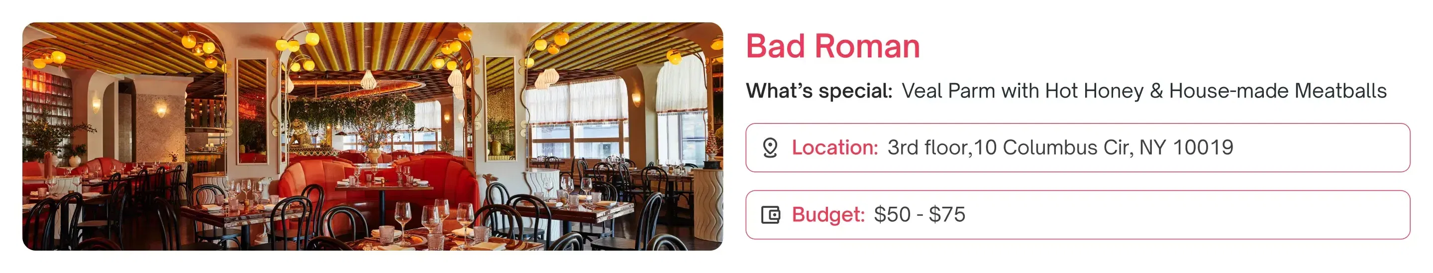 Bad Roman is the perfect spot for night owls craving classic Italian-American dishes with a creative twist. Alongside its signature veal parm, the menu also has dishes like crispy calamari and creamy rigatoni alla vodka, keeping the flavors exciting.