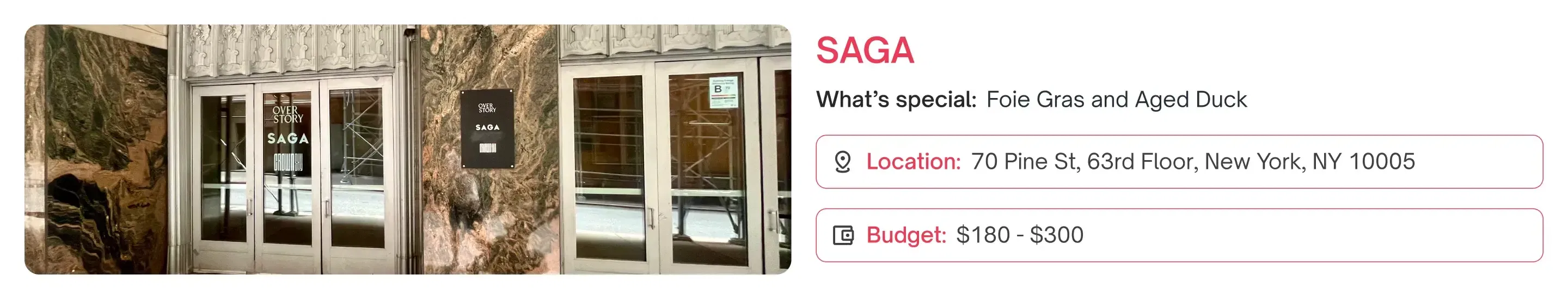SAGA offers an upscale dining experience with stunning East River views that make it worth the splurge. The menu includes refined choices like black trufflerisotto and roasted lamb, all complemented by expert tableside wine service.