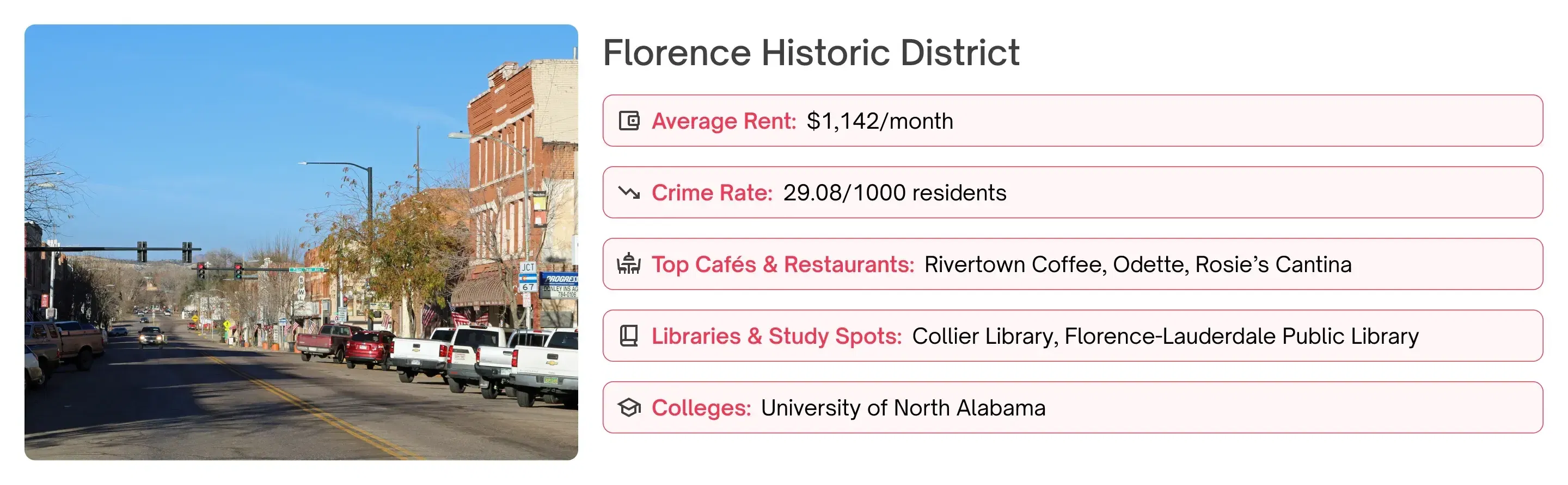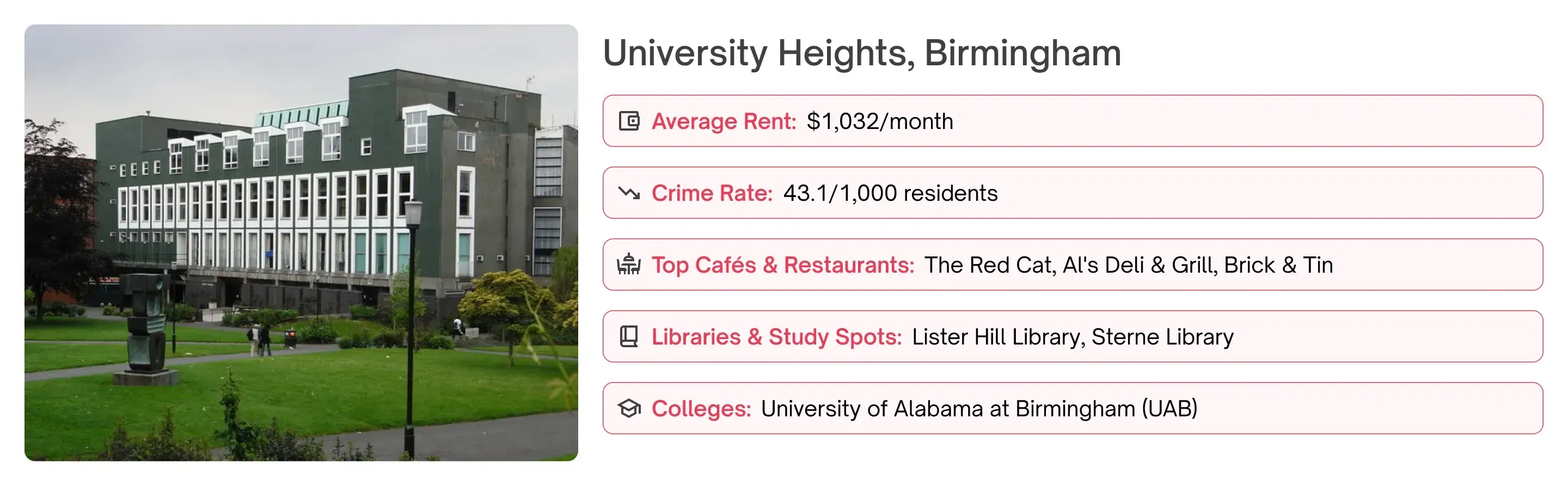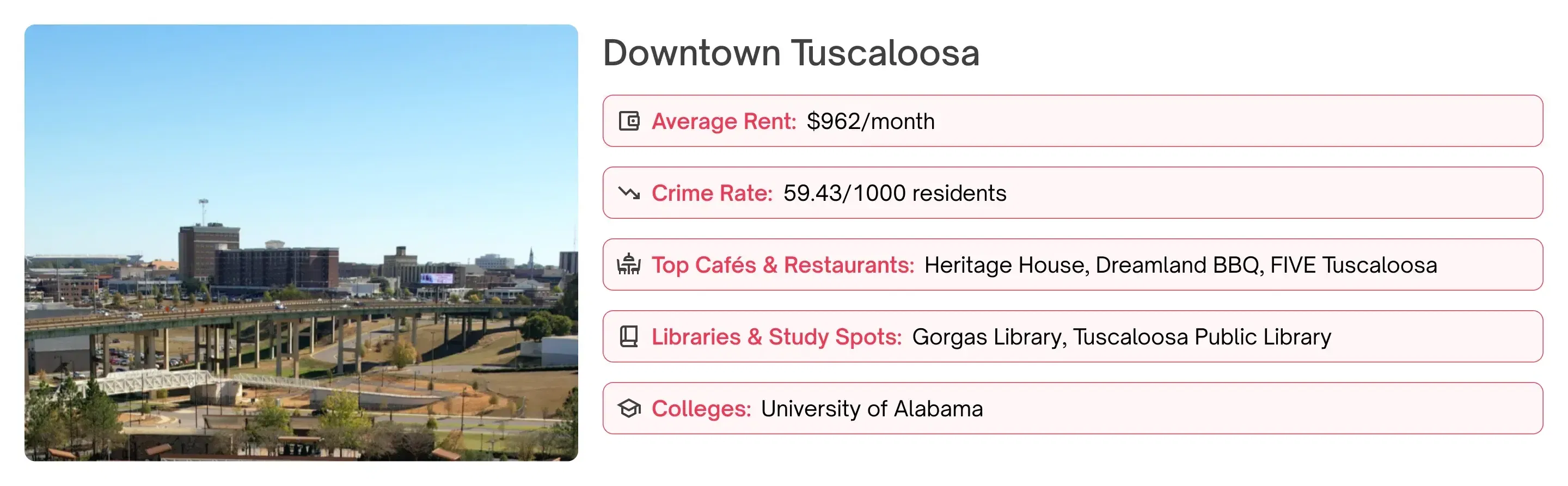Most student neighborhoods in Alabama are affordable, close to campus, and have a few places to eat and study. Some are more social, while others are better for quiet living.
