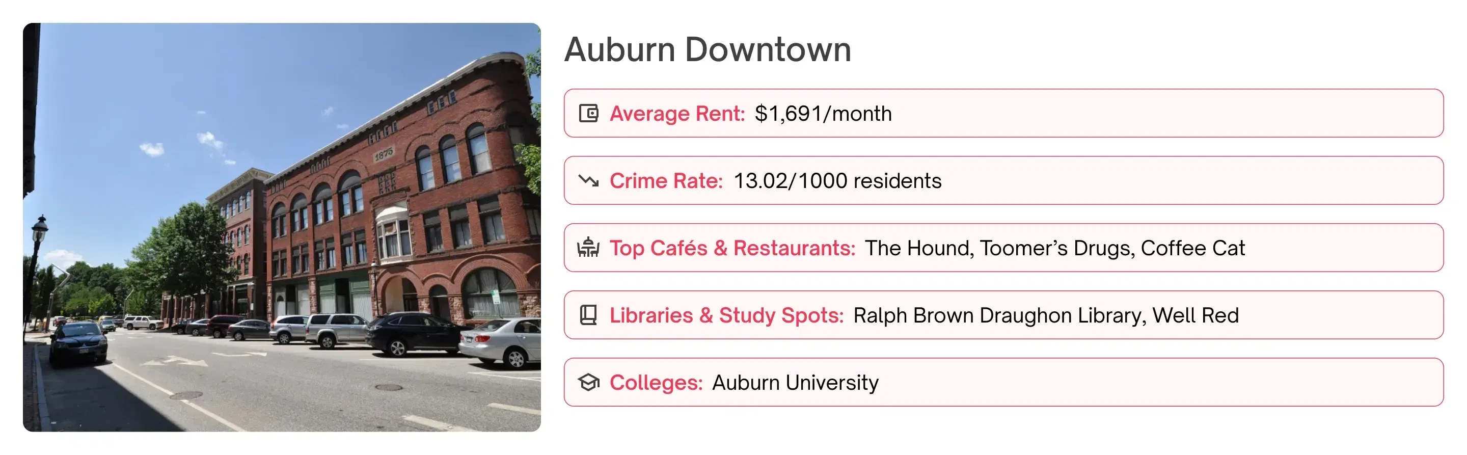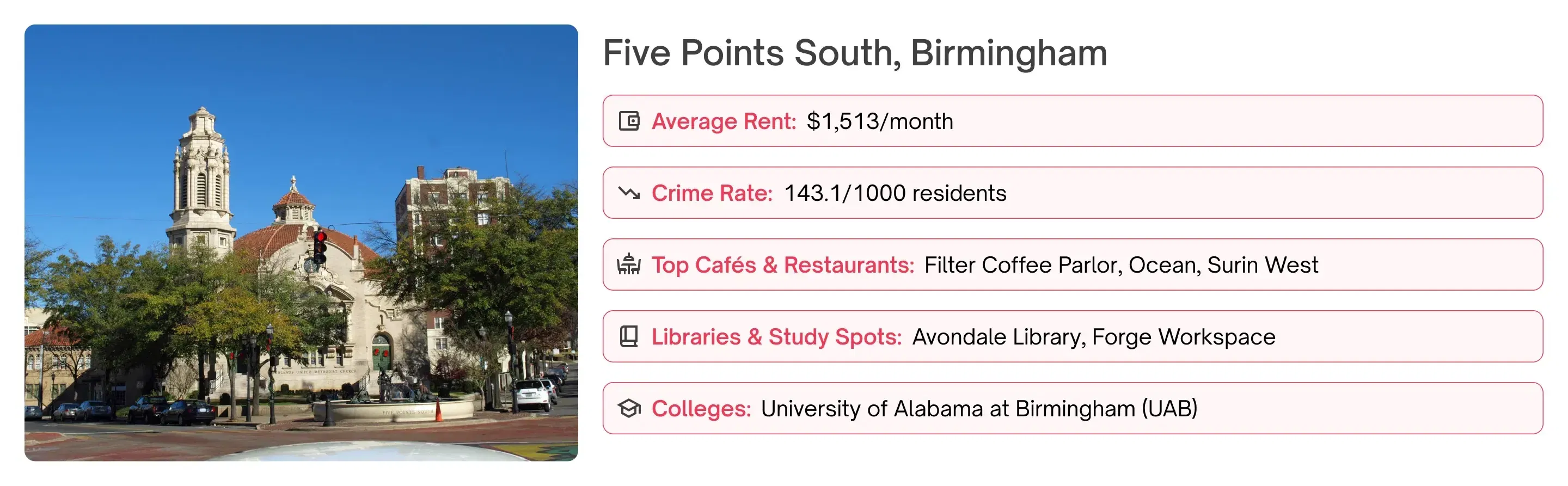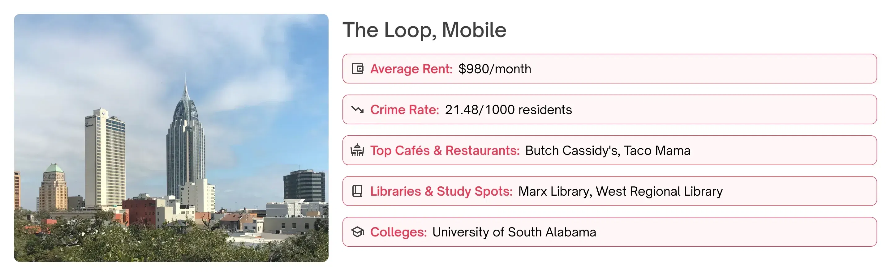 Most student neighborhoods in Alabama are affordable, close to campus, and have a few places to eat and study. Some are more social, while others are better for quiet living.