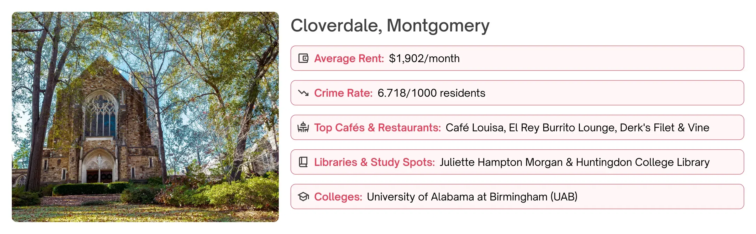 Cloverdale feels like a small town inside the city, with tree-lined streets and historic homes. It’s popular with students from Huntingdon College and Alabama State University who want peace and quiet.