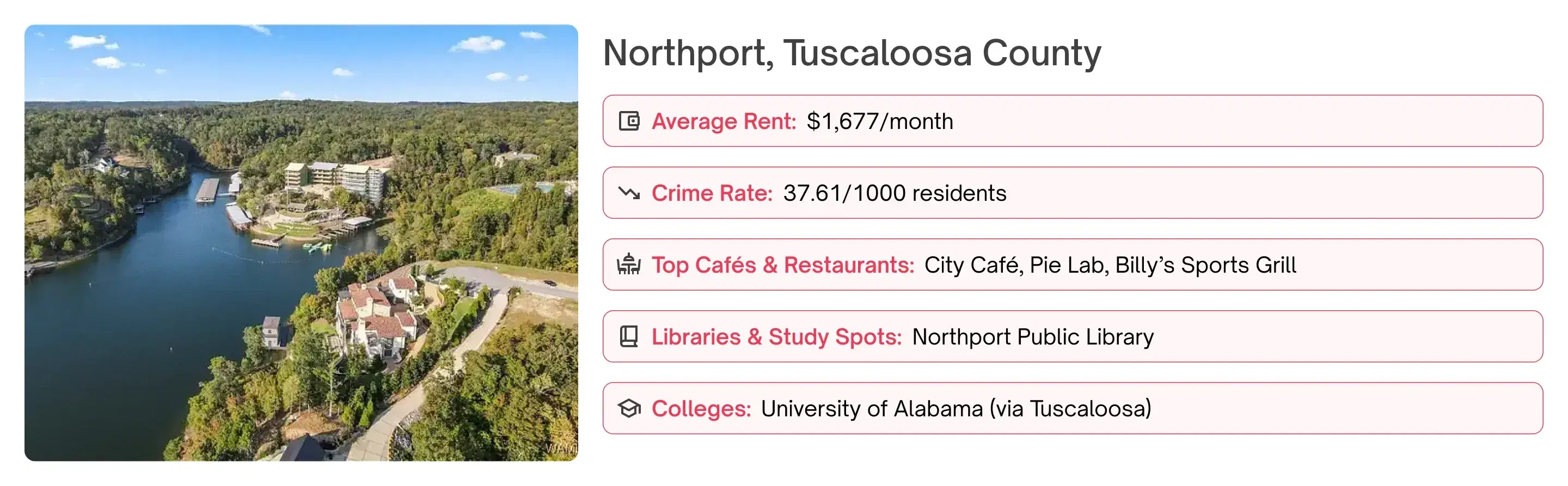 Northport sits just across the Black Warrior River from Tuscaloosa and gives students a quieter option with more space. It’s mostly residential, with a small-town vibe and some local shops and diners.