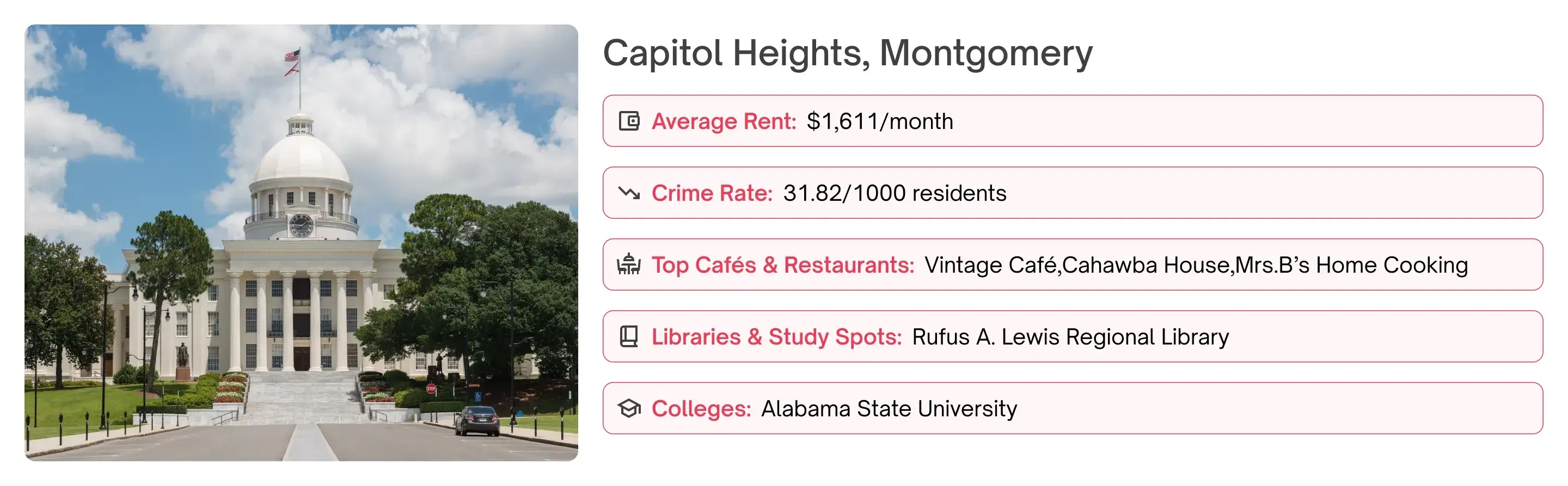 Capitol Heights has older homes, narrow streets, and a quiet, suburban atmosphere. It's a lesser-known option among the best neighborhoods in Montgomery AL, but it appeals to students who want something residential without being far from downtown or campus.