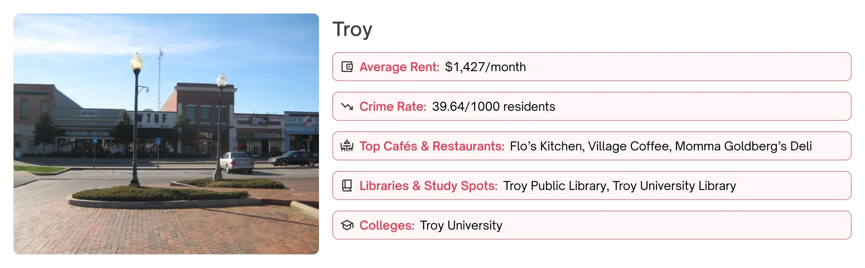 Downtown Troy has a small-town feel with a walkable square, older brick buildings, and a mix of student-friendly spots. It’s one of the best places to live in Alabama and students choose student housing in Troy because the university is close—you can walk to campus in about 10–15 minutes.