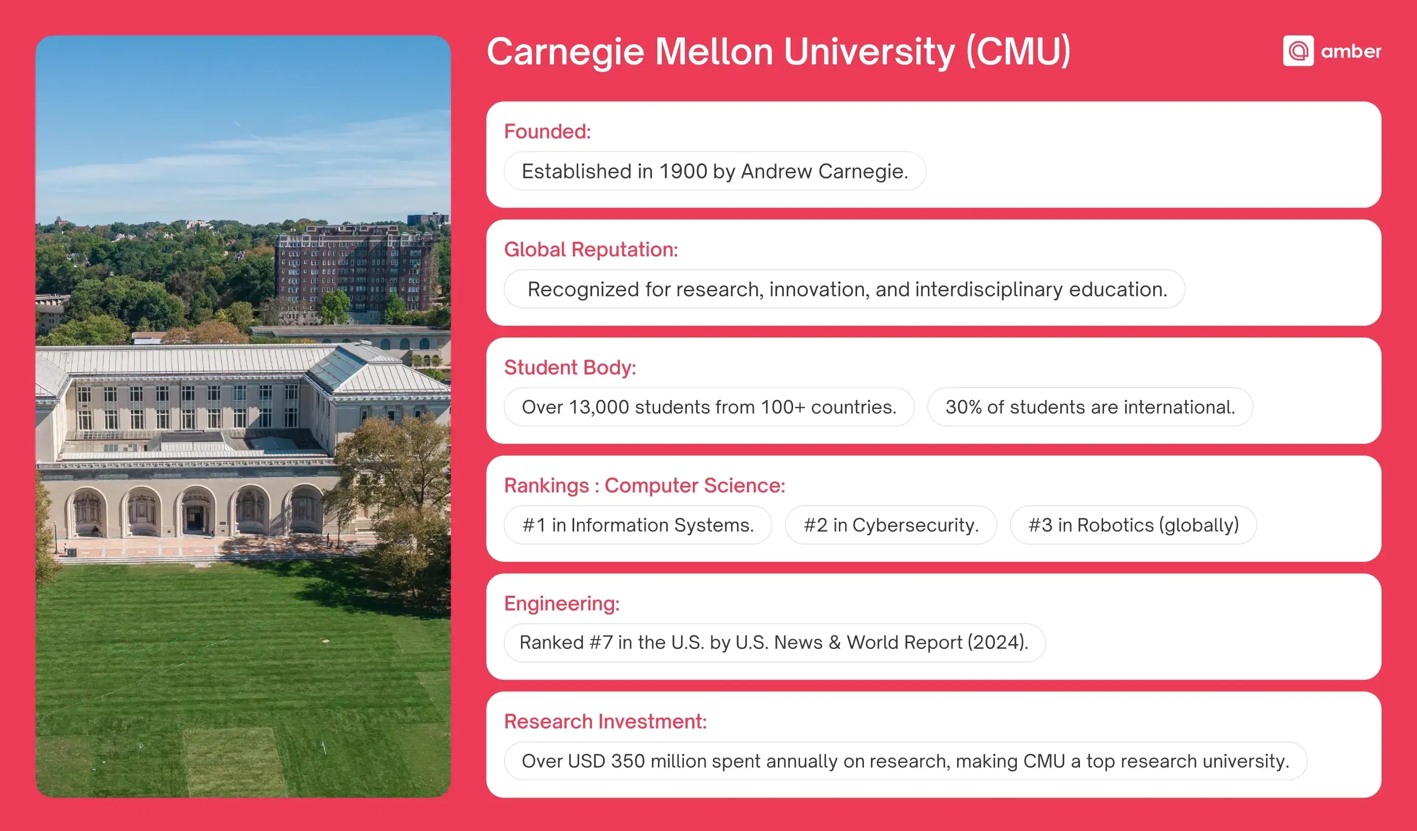 Founded in 1900 by Andrew Carnegie, CMU has become a hub for research, innovation, and interdisciplinary education. The university is recognized globally for its emphasis on blending theory with practice to prepare students for success in their careers. CMU is home to more than 13,000 students from over 100 countries, with approximately 30% of the student body being international.