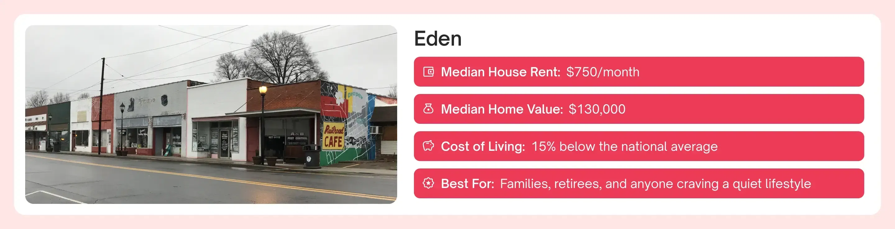 Eden is often hailed as one of the most affordable places to live in North Carolina, mainly because of its very low housing costs and calm, small-town vibe. It’s a place where your rent won’t break the bank, and buying a home here is well within reach if you’re on a budget. The local community is friendly and welcoming, making Eden a solid choice if you want the cheapest city to live in North Carolina without sacrificing comfort.