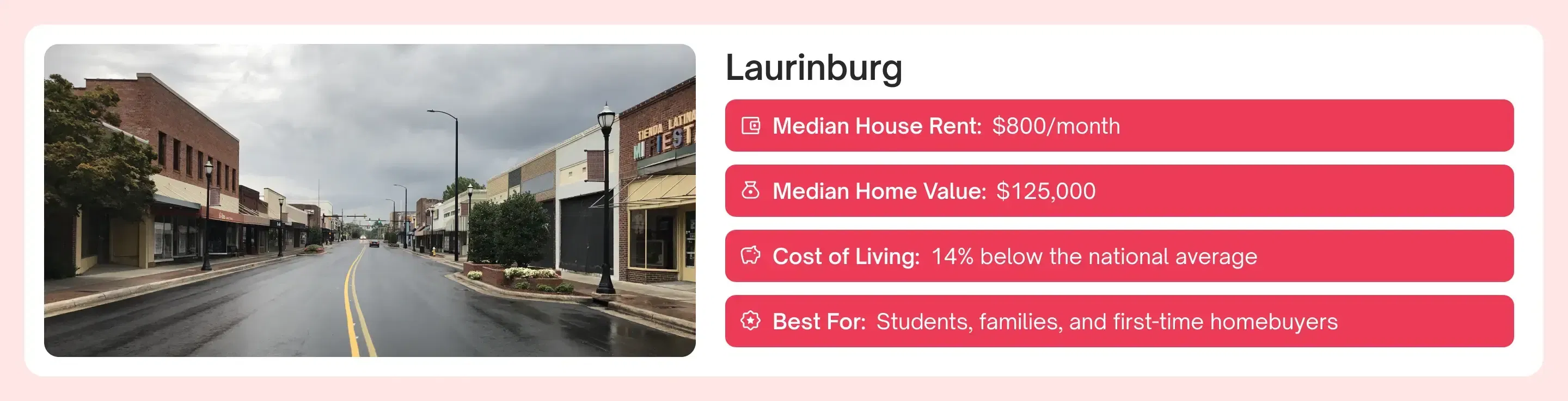 Laurinburg shines as one of the affordable places to live in NC, thanks to its blend of low rent and home prices, plus a close-knit community feel. If you’re searching for cheap cities to live in North Carolina with local charm and affordable amenities, Laurinburg fits the bill perfectly. It’s also great for students, given its proximity to colleges and educational facilities.