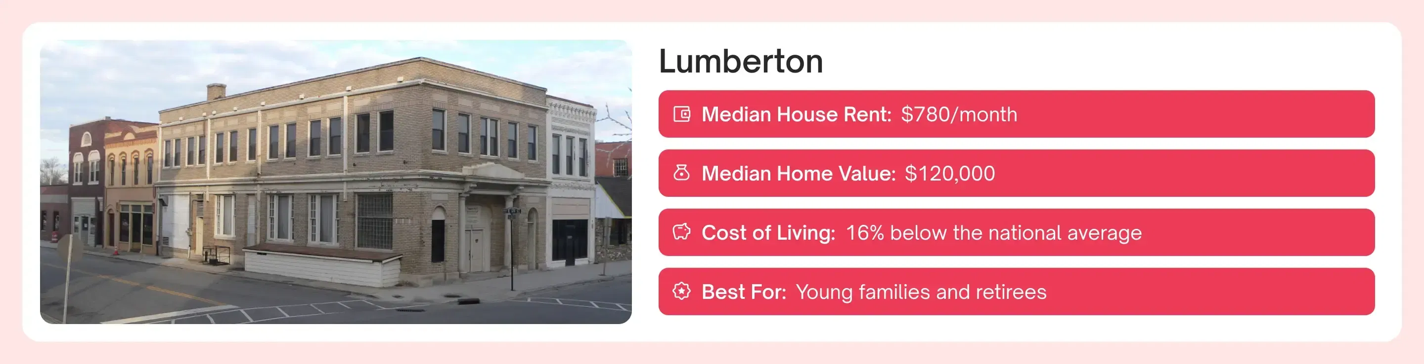 Lumberton is another standout in the list of the cheapest places to live in North Carolina, boasting some of the lowest housing costs in the state. The town offers a nice balance of affordability and accessibility to services, schools, and parks. It’s particularly popular among families and retirees who want to enjoy the most affordable places to live in North Carolina with plenty of quiet neighborhoods and community spirit.