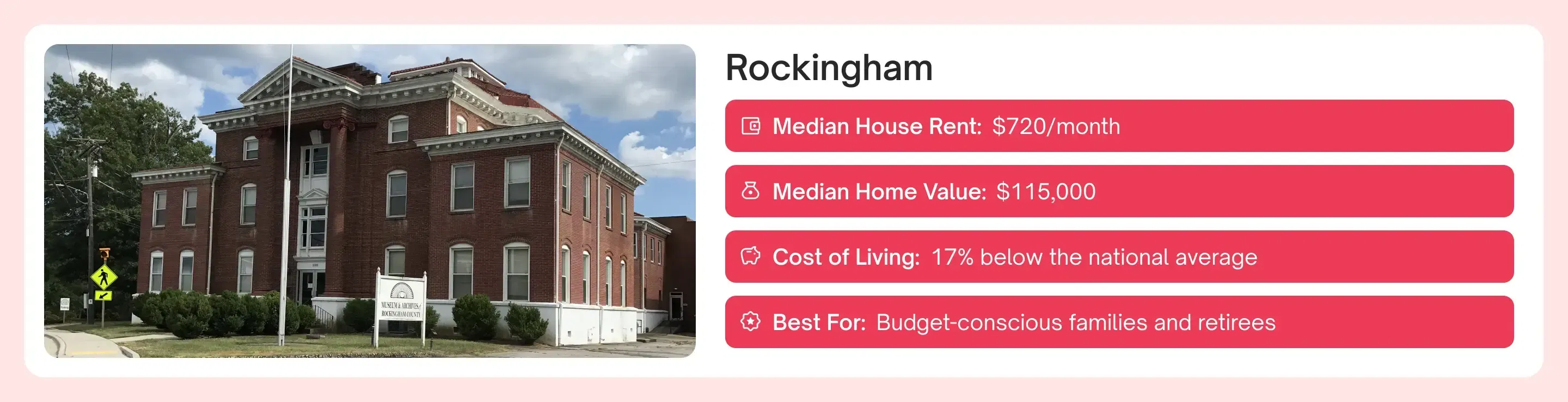 Rockingham ranks high among the cheapest places to live in North Carolina because of its incredibly low home prices and rents. This town offers a laid-back lifestyle with easy access to natural parks and local shops. If you want to live in one of the most affordable places to live in North Carolina without giving up community charm, Rockingham should be on your list.