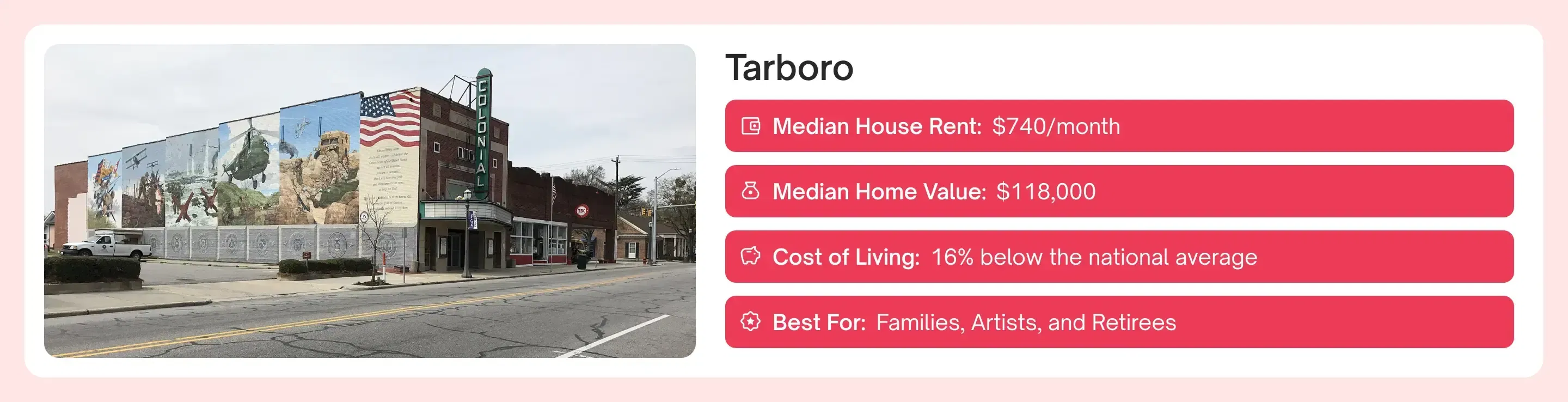Tarboro is a hidden gem among affordable places to live in NC, boasting historic charm and affordable housing. Its slow pace and welcoming community make it attractive for those searching for the cheapest cities to live in North Carolina. The town is also growing in popularity with artists and remote workers, thanks to its friendly vibe and lower living costs.