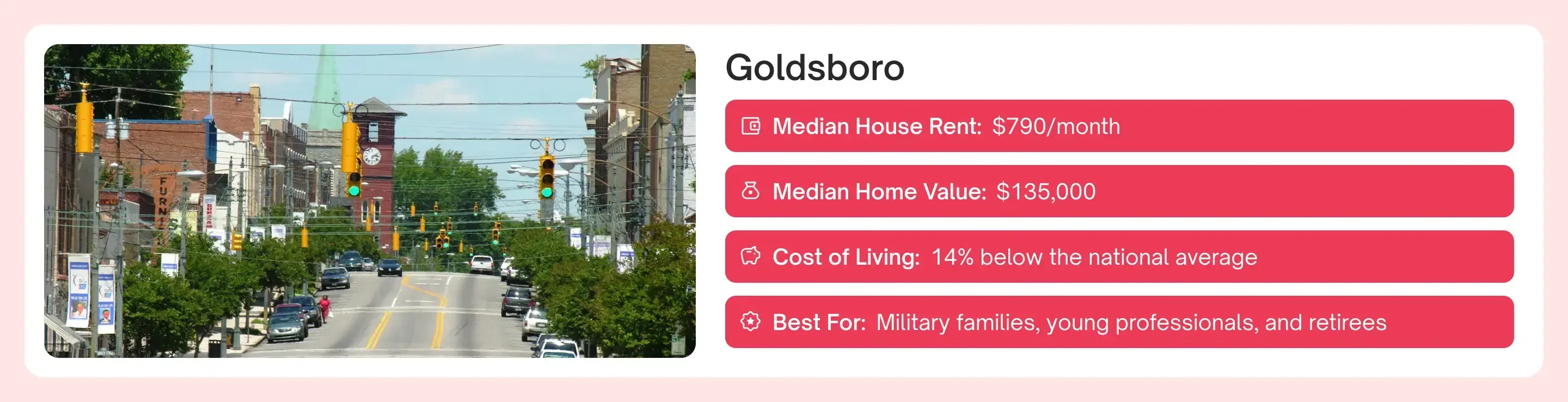 Goldsboro stands out as one of the most affordable places to live in North Carolina, especially appealing to military families due to its proximity to Seymour Johnson Air Force Base. The city offers reasonably priced housing and a cost of living well below the national average. It’s a solid option if you want to find an affordable place to live in North Carolina that mixes affordability with a vibrant community atmosphere.