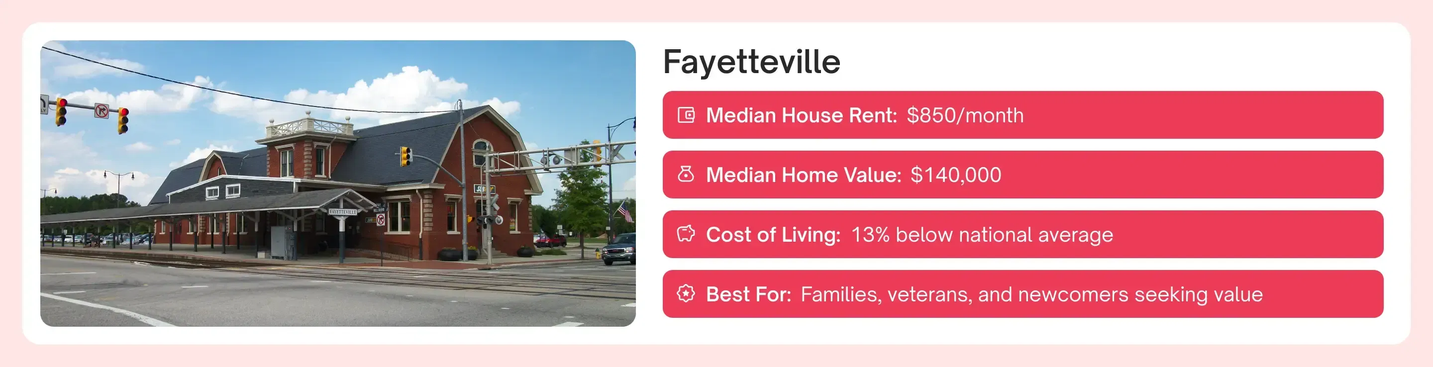 Fayetteville is frequently mentioned among the cheapest places to live in North Carolina thanks to its competitive housing prices and low overall living costs. The city’s rich history and community services make it one of the best affordable places to live in North Carolina for people who want both value and amenities close at hand.