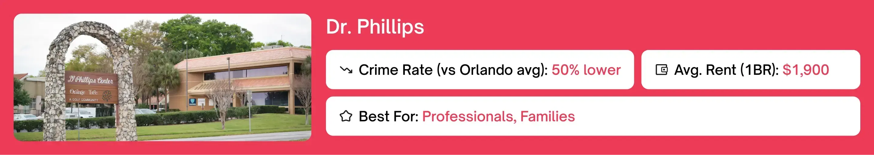Average Rent: The typical rent at Dr. Phillips is between $1,900 and $2,500 for a one- to two-bedroom unit, indicative of its upscale nature as Orlando's safest neighborhood.
