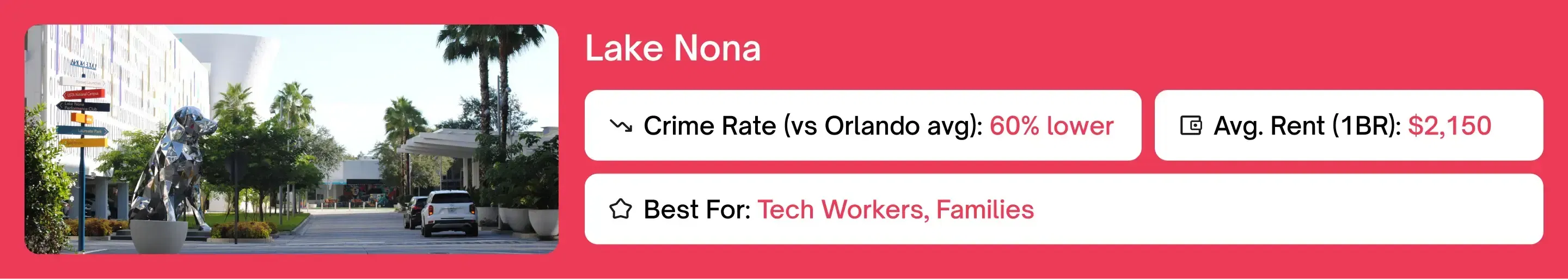 Lake Nona | 60% lower | $2,150 | Tech workers, families |