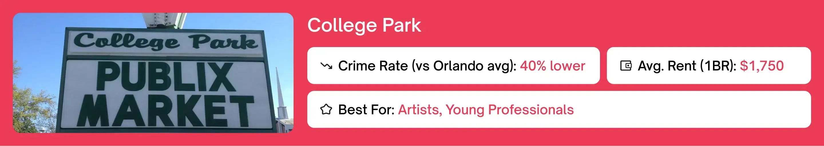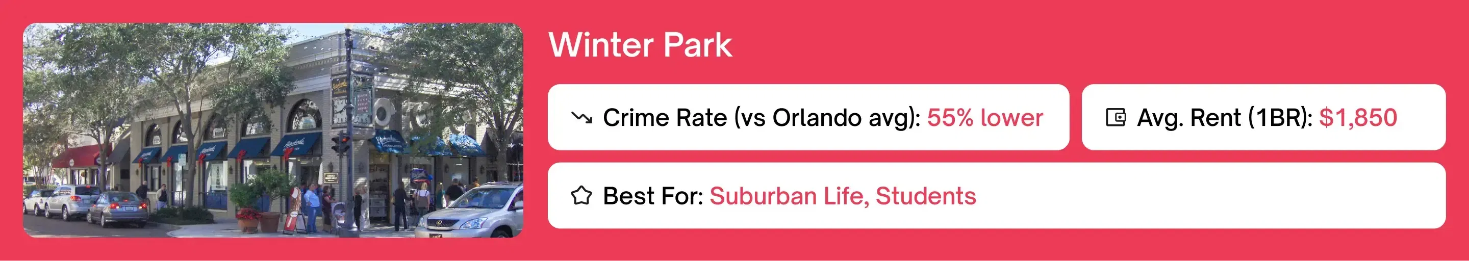 Winter Park | 55% lower | $1,850 | Suburban life, students |