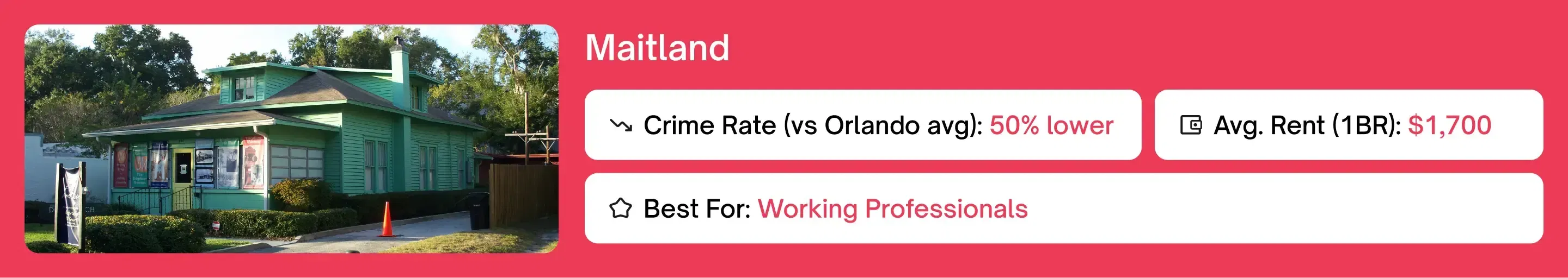Crime Rate: Maitland boasts a crime rate lower than the Florida average and far below the Orlando metropolitan area. Its steady ranking as one of the safest neighborhoods in Orlando makes it a good choice for long-term residents.