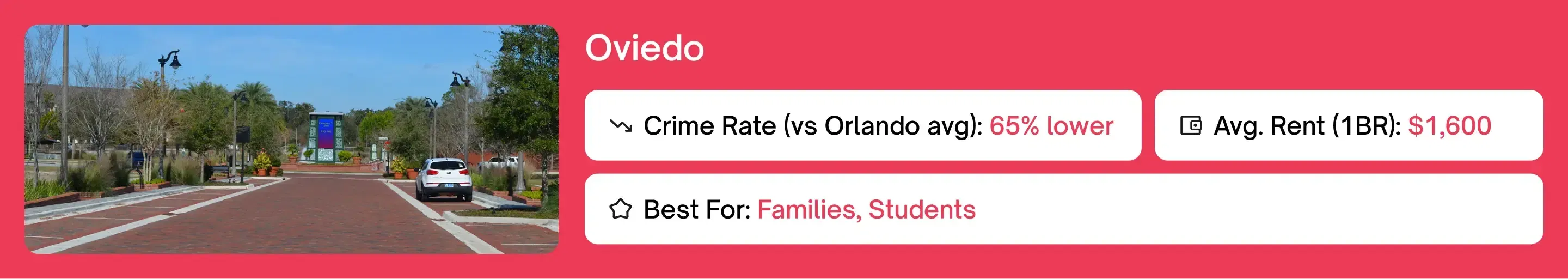 Ideal For: Oviedo is perfect for families, university students (especially from nearby UCF), and professionals who prioritize safety, schools, and suburban peace.