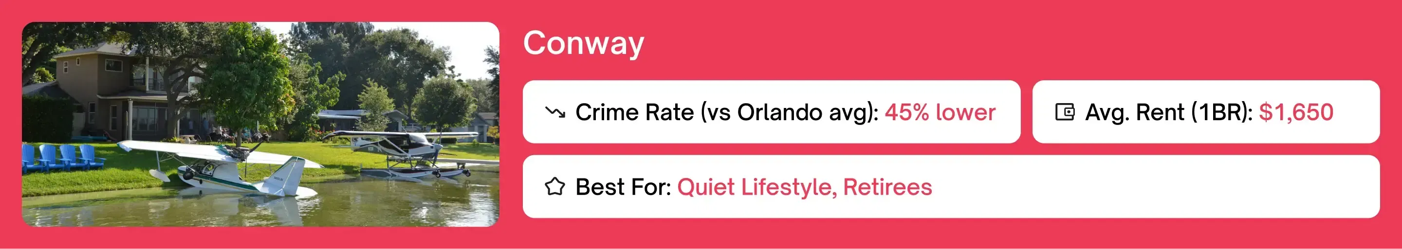Ideal For: Conway is ideal for middle-class families, educators, and young professionals looking for a relaxed, safe life in one of the safest places to live in Orlando.
