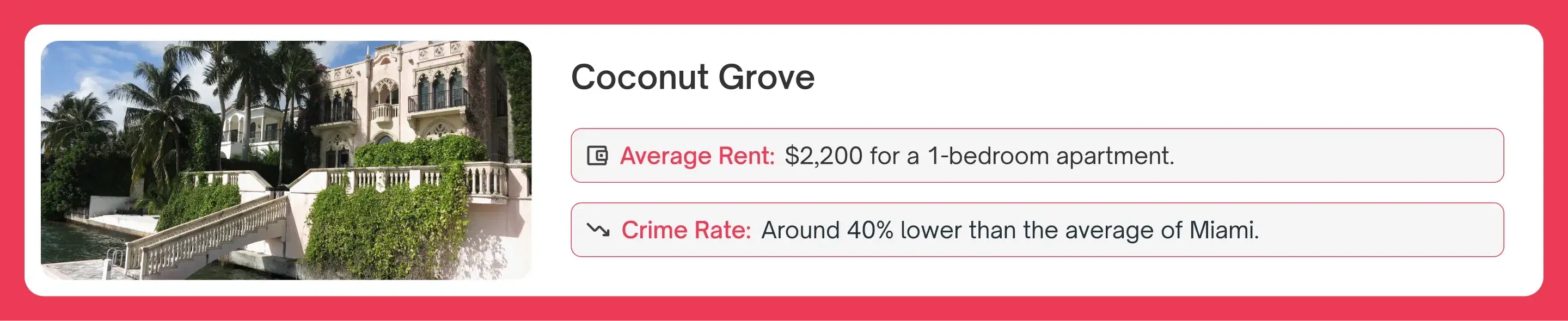 If you are looking for a neighborhood that balances safety with natural beauty, Coconut Grove should be on your list. This charming area boasts lush greenery, historic homes, and a bohemian vibe that attracts both families and creatives. It is considered one of the safest neighborhoods in Miami due to its community-driven approach, with local police maintaining a watchful eye on the area’s peaceful streets. Coconut Grove is especially famous for its consistent ranking among the safe areas to stay in Miami, and is perfect for short-term guests and long-term residents.