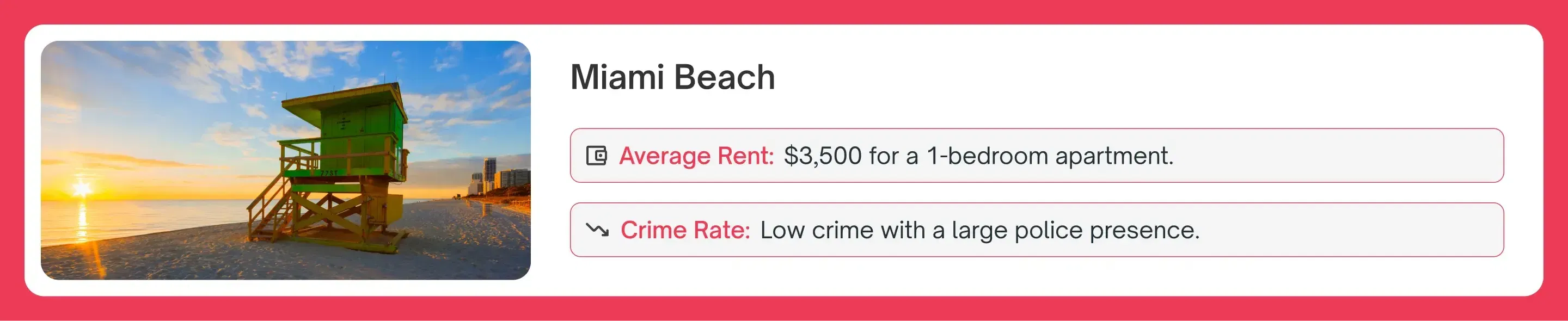 Miami is a city full of contrasts — from laid-back beach vibes in Sunny Isles Beach to the energetic nightlife of South Beach. To fully enjoy your stay in Miami, check this reliable Miami guide and research the area’s safety records to ensure you are in a safe area to stay in Miami. Always take precautions such as securing valuables and avoiding poorly lit streets late at night.