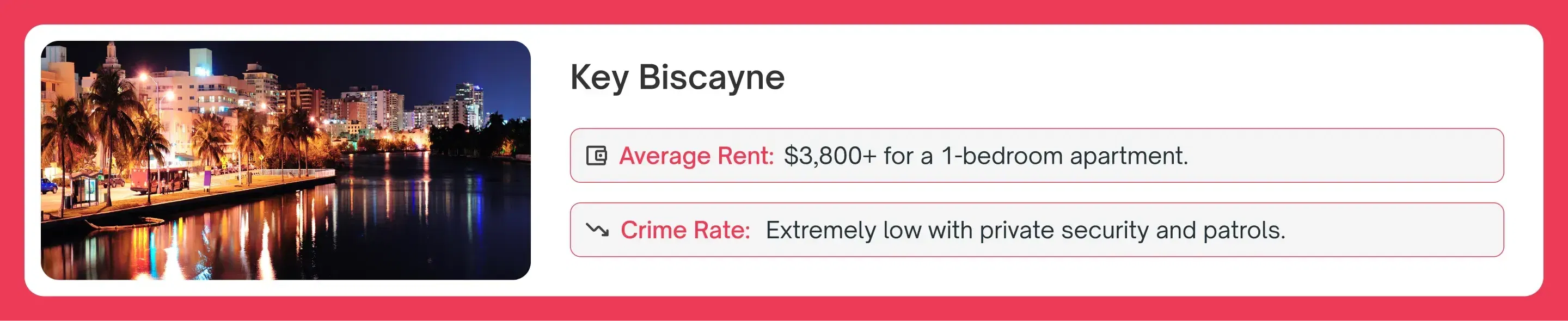 Key Biscayne is a private, high-end island community that enjoys a luxurious way of life and stunning views. It is rated as one of the safest places to live in Miami, with its residents enjoying the best of privacy and security. The limited access and compact size of the island ensure safety for residents, and its tranquil environment is ideal for those in search of seclusion. Low crime rate and a close-knit community make it a perfect holiday destination for families and retirees.