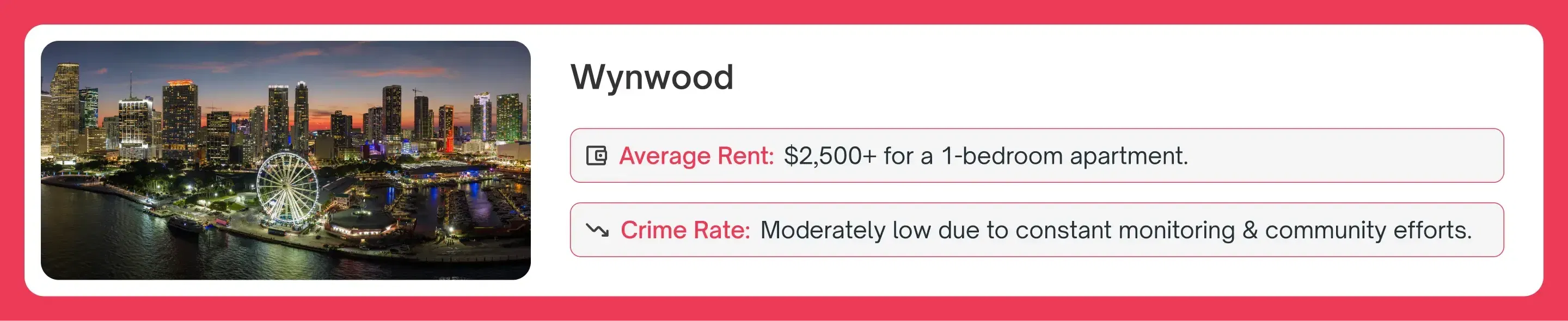 Famous for its street art, Wynwood has become one of the safest neighborhoods in Miami for tourists and residents. With its beautiful murals, art spaces, and active community, Wynwood is a balance of safety and culture. The area has been rejuvenated over the years, and locals and tourists alike are attracted to it. The frequent presence of security patrols and neighborhood watch programs makes this the perfect location for young professionals and families who wish to enjoy Miami's artistic vibrancy in a secure setting.