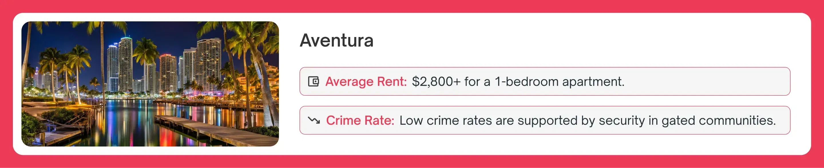 Aventura, a bustling suburban community situated just north of Miami Beach, is among the safest places to stay in Miami. Famous for its high-end living, fine shopping malls, and proximity to the best schools, Aventura presents a safe living environment with gated neighborhoods and high-end condominiums. With round-the-clock security patrols and an aggressive local police force, this area is a first preference among families and retirees in search of safety and a suburban way of life.