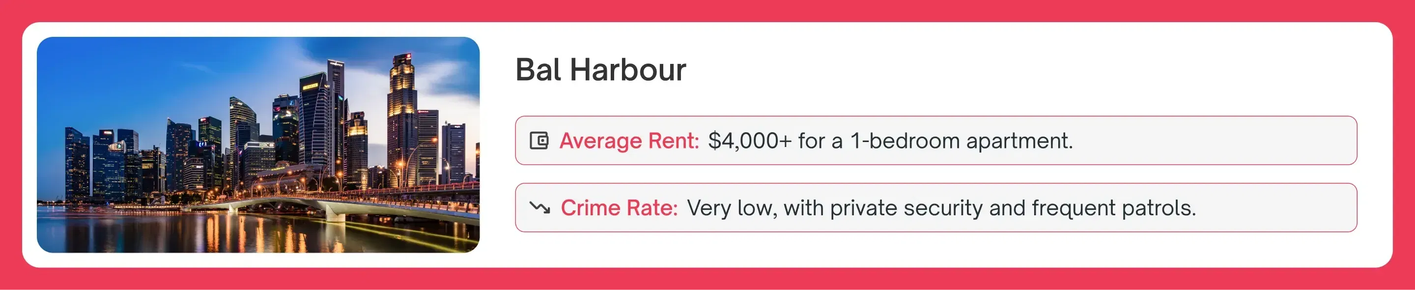 Why is it Safe? Exclusivity of the neighborhood and its high-profile neighbors guarantee Bal Harbour continues to be among the safest locales in Miami. High-end security features and private patrols are primary reasons why it stays safe.