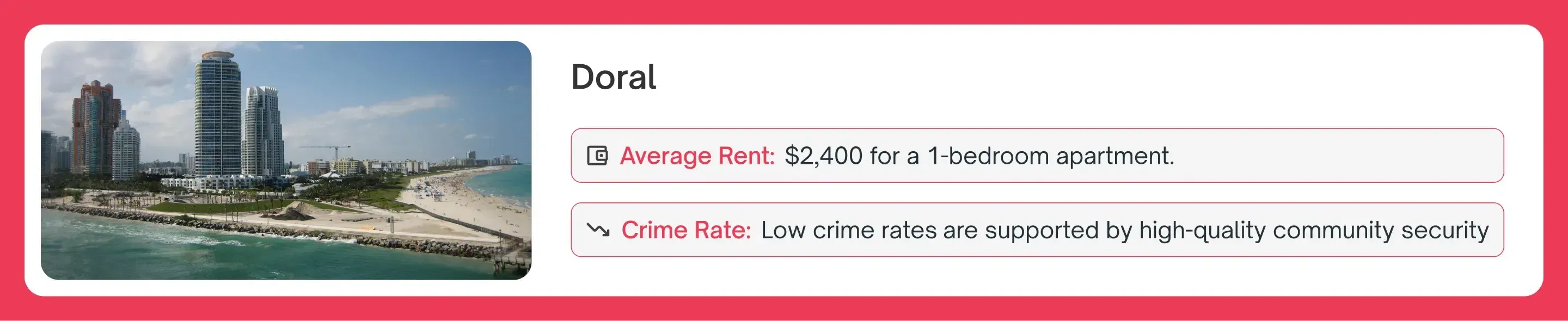 Doral, which sits just west of Miami International Airport, provides an upscale suburban life that is not only family-oriented but also secure. With both gated communities, parks, and quality schools, Doral is a favorite choice among families that are looking for safe areas to live in Miami. The area has well-upkept homes as well as low crime rates due to both private security and a vigilant local police department.