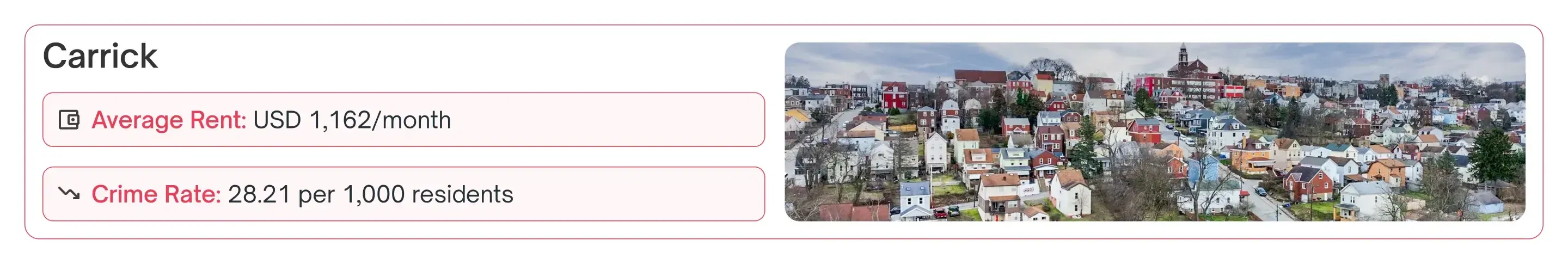 Carrick is one of the best neighborhoods in Pittsburgh for those seeking affordability, diversity, and a welcoming community vibe. Just five miles from downtown, it offers a suburban atmosphere with easy city access, making it a great option for student housing in Carrick as well.