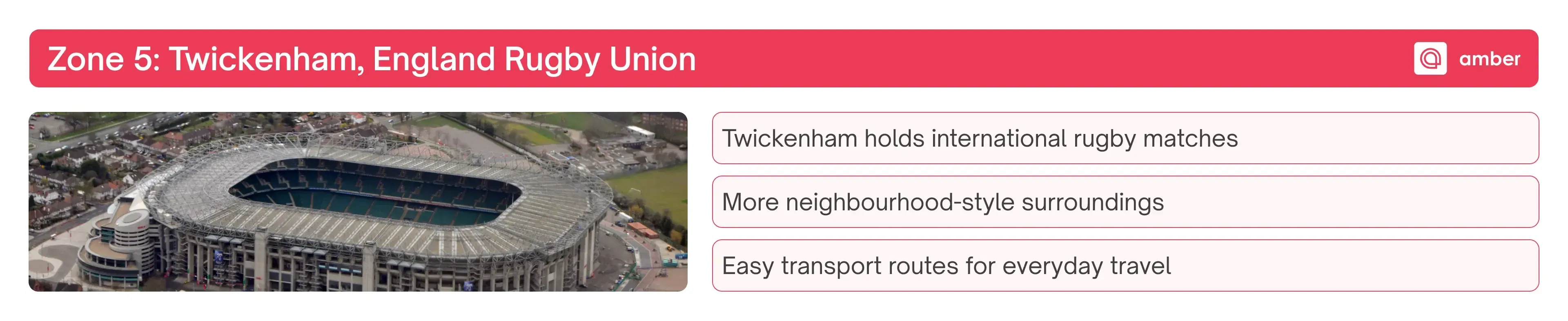 A haven for rugby enthusiasts, Zone 5 is home to Twickenham Stadium, the world's largest dedicated rugby union venue, and the heart of England Rugby.