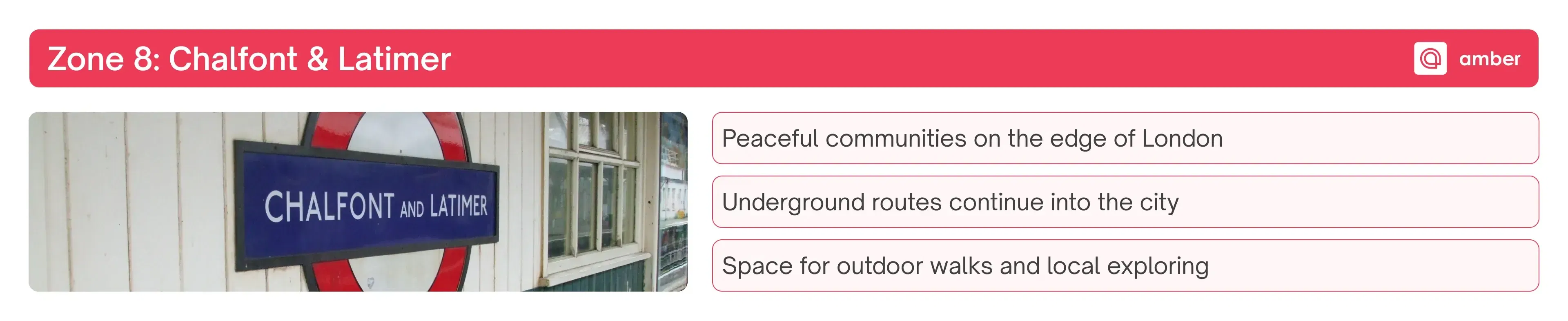 Zone 8: Chalfont & Latimer – A peaceful area with open spaces, providing a serene escape from the bustling city.