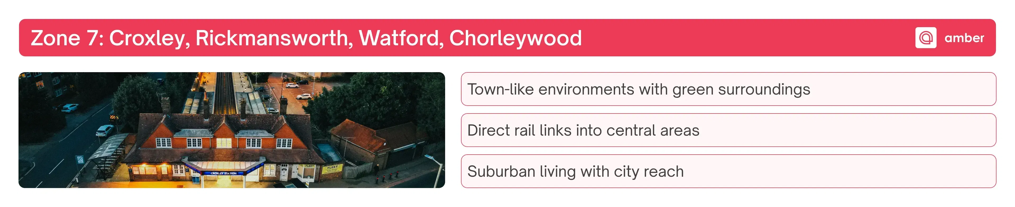 Zone 7: Hertfordshire Stations – Includes towns like Watford, Croxley, and Chorleywood, offering suburban tranquillity and accessibility.
