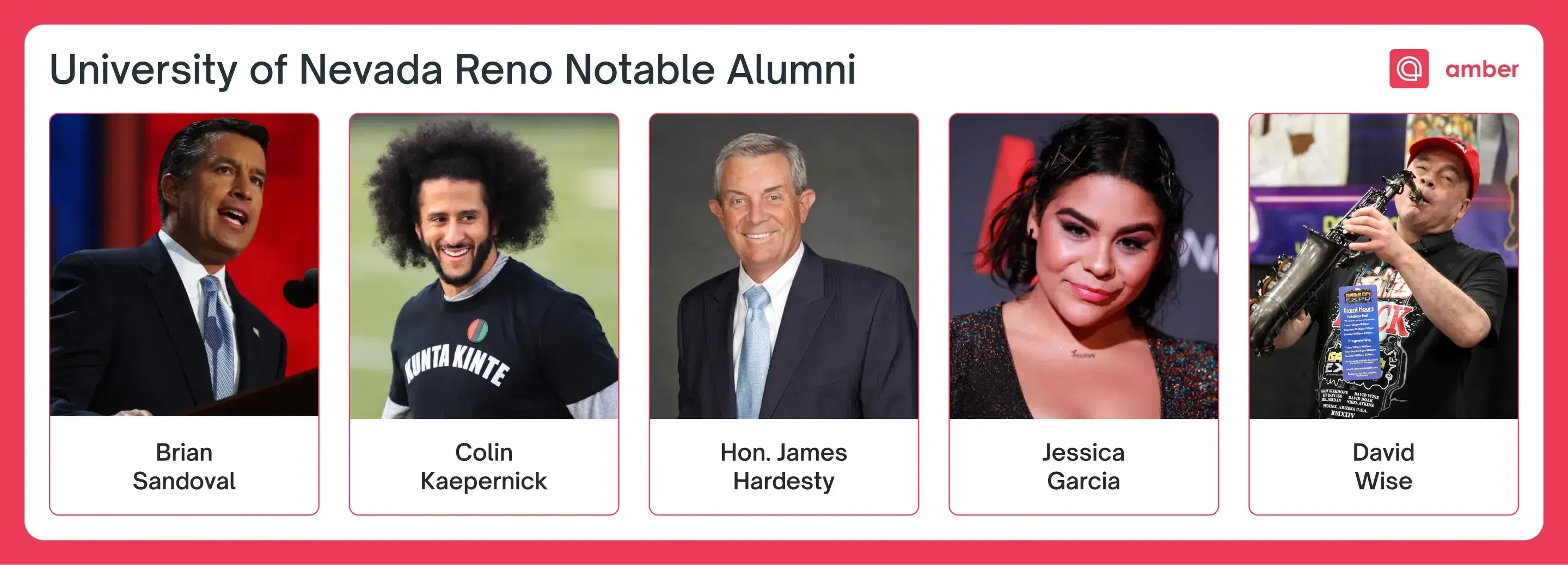 The University of Nevada Reno pivots on a proud legacy of alumni who have excelled in politics, business, entertainment, and athletics. Their success is representative of its principles of excellence, leadership, and preparedness in the world.