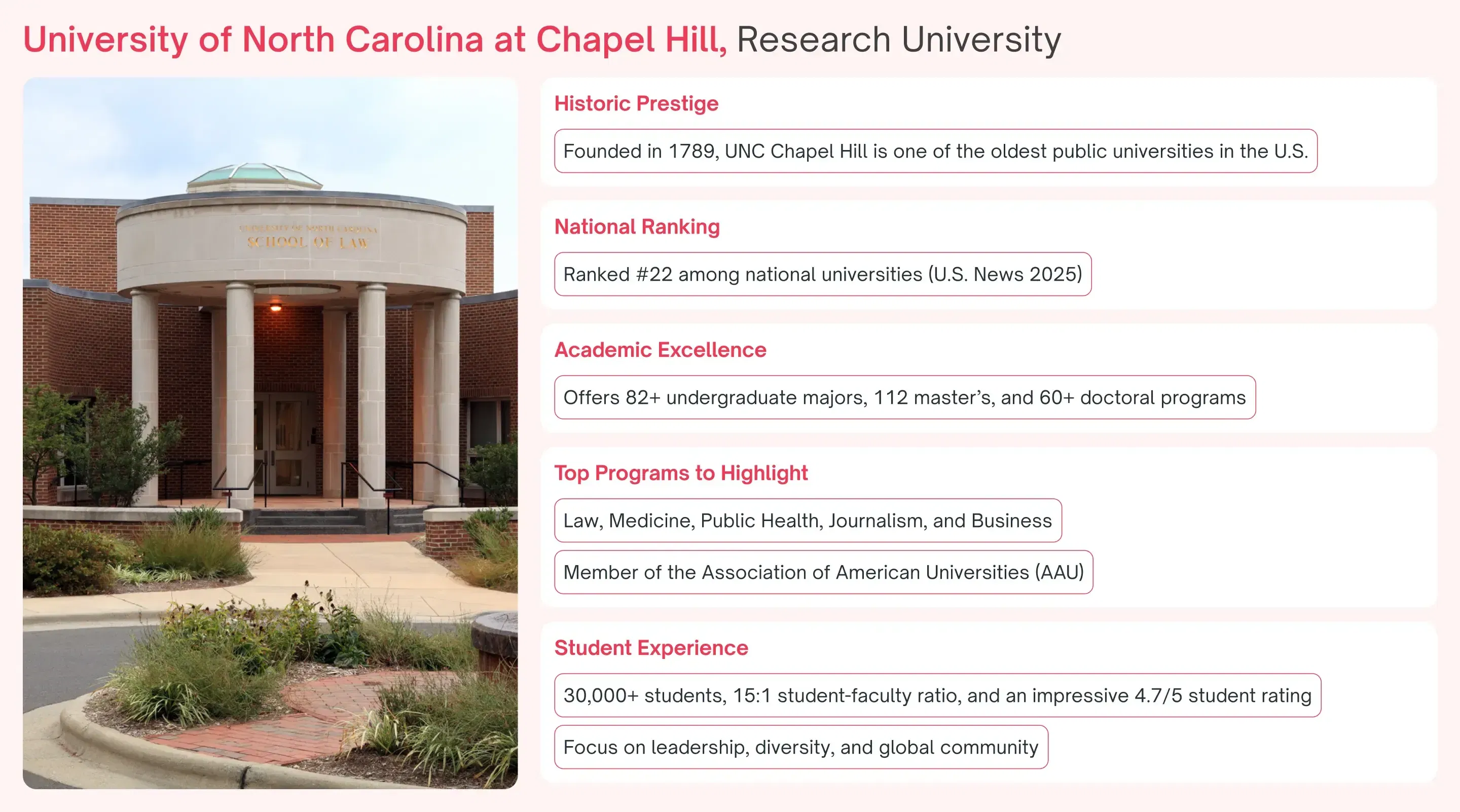 Founded in 1789, the University of North Carolina at Chapel Hill is one of the oldest public universities in the United States. It is consistently ranked among the top public universities in the country. In fact, the UNC Chapel Hill rank currently stands at #22 among national universities according to U.S. News 2025 Rankings. As part of the prestigious Association of American Universities (AAU), the University of North Carolina offers over 82 undergraduate majors, 112 master’s programs, and more than 60 doctoral degrees. It’s especially noted for programs like UNC Chapel Hill Law, medicine, public health, journalism, and business. With over 30,000 students from across the globe, a student-faculty ratio of 15:1, and an average UNC Chapel Hill rating of 4.7/5 by students, the university continues to uphold its mission of preparing future leaders and changemakers.