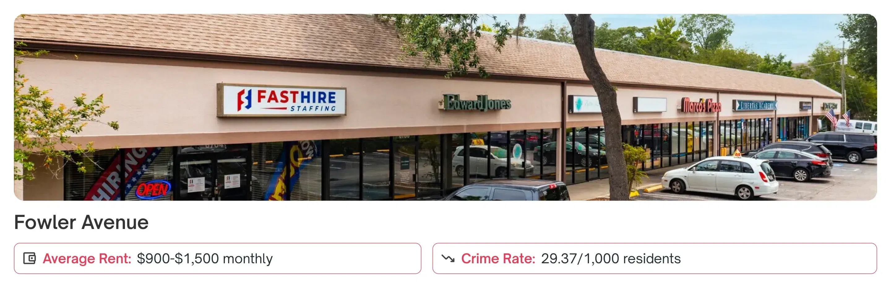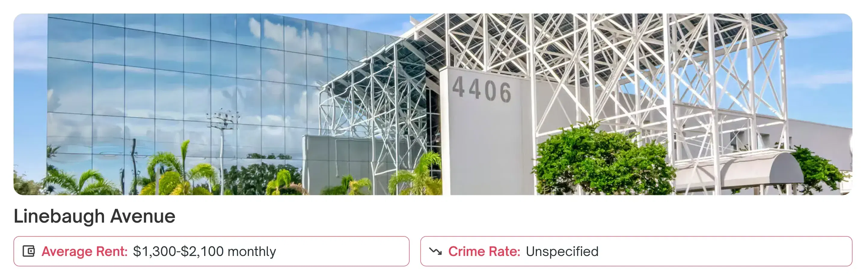 The University of South Florida is just a short drive away, making morning commutes stress-free. Plus, the area offers affordable student housing in Linebaugh Avenue compared to downtown options.