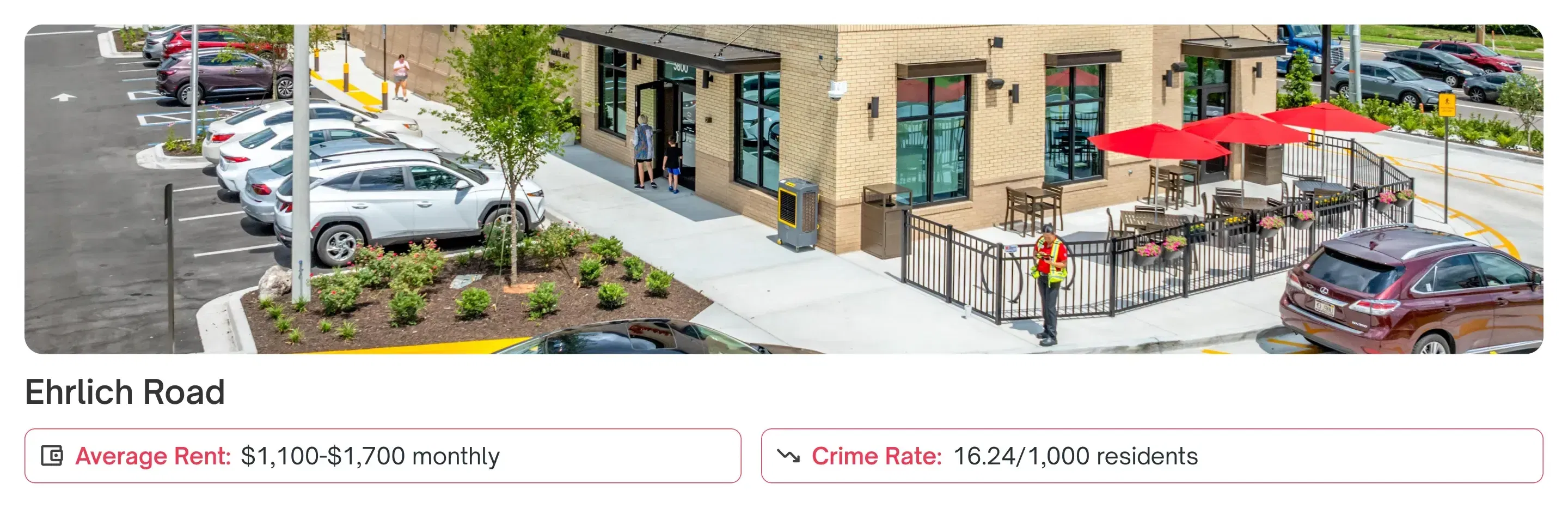 With numerous grocery stores, pharmacies, and casual dining options, you have all the options within your reach. Students appreciate the affordable options for student housing in Ehrlich Road, which typically cost less than neighborhoods closer to downtown.